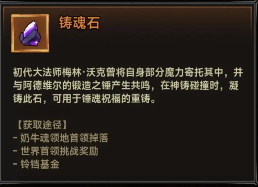 铸魂石获取:偶尔做下活动和世界boss随便混一下即可,慢慢囤积。