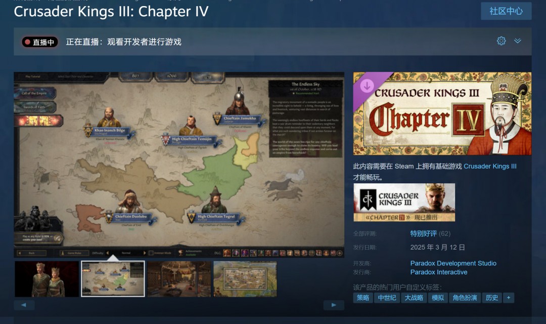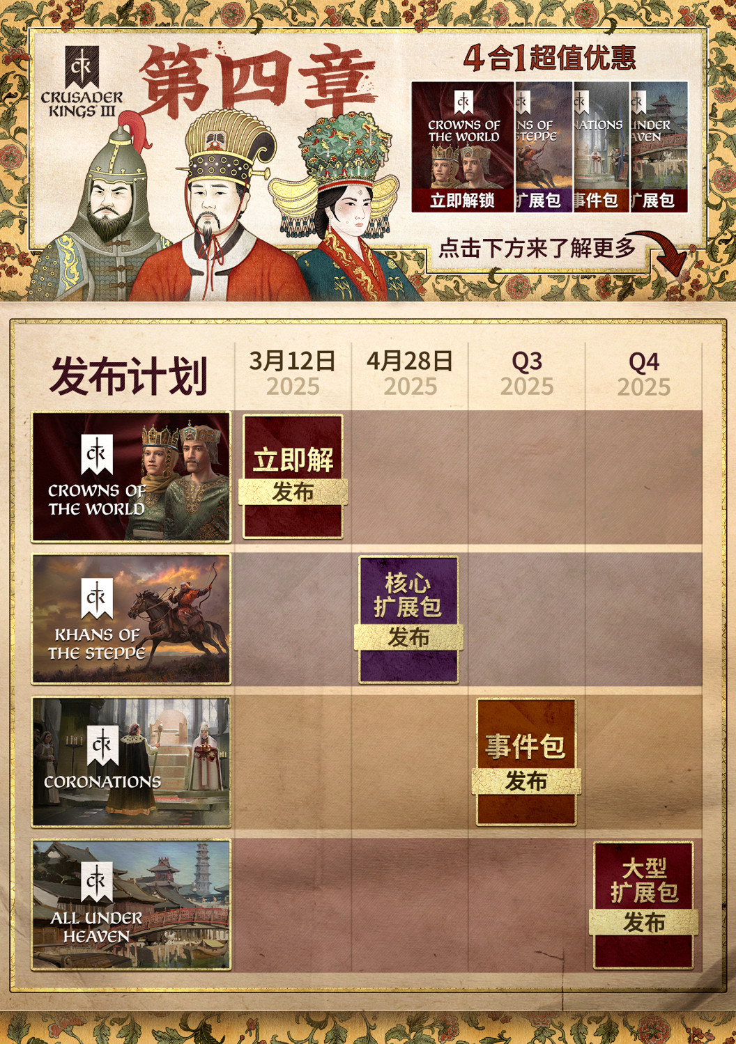 「第四章」是《十字军之王》历史上最雄心勃勃的内容周期,从「草原汗王」中作为游牧统治者维持牧群的斗争,到「加冕典礼」中仪式和责任的分量,最后到「溥天之下」中世纪世界地图的最终补全,一切应有尽有。无论您选择在游戏中引入的新区域,还是以现有的最爱区域进行游戏,「第四章」都将重新定义您在《十字军之王 III》中创造的故事。