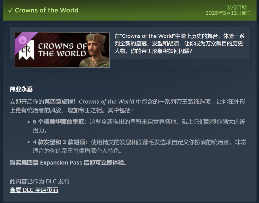 1.15 “Crown | 王冠” 更新和「第四章」季票现在都可以使用。所有《十字军之王 III》的用户都可以免费获得“王冠”更新,而购买季票的用户则可以在「世界之冠」发布后立即获得「世界之冠」以及上述所有内容。