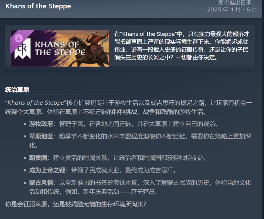 核心扩展包:「草原汗王」,即将推出日期:2025年4月28日