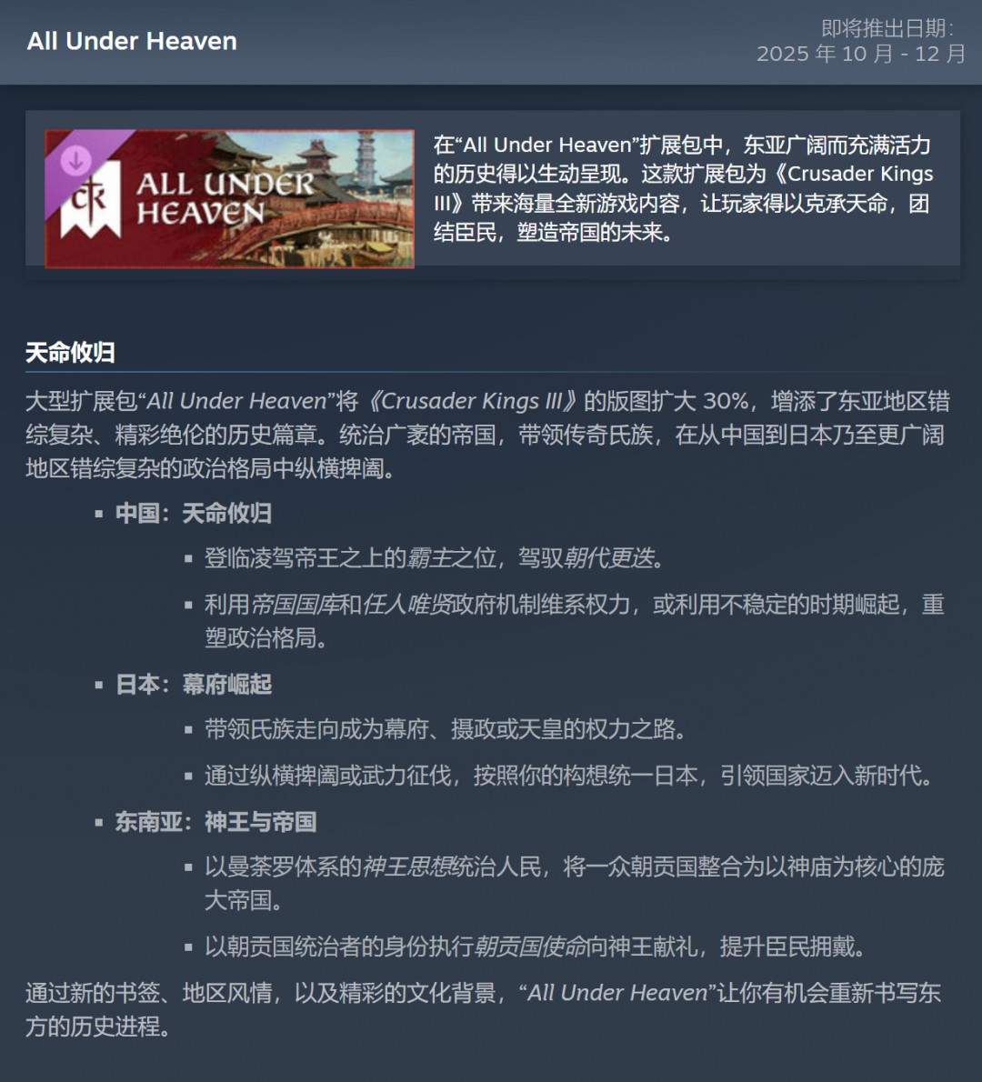 大型扩展包:「溥天之下」即将推出日期:2025年10月-12月