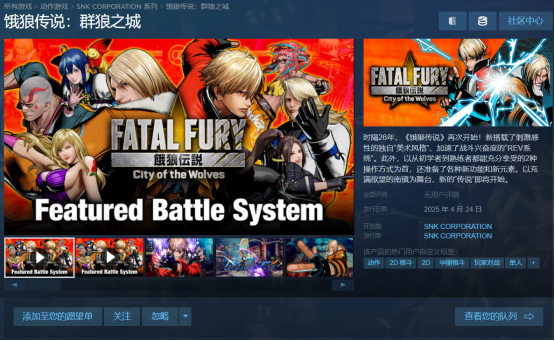 现在《饿狼传说:群狼之城》的Steam页面已经上线,试玩入口就在页面下方,如果你有兴趣,可以将游戏加入愿望单,正式版将于4月24日(周四)发售,现在预购数字版即可在4月21日(周一)抢先开玩。