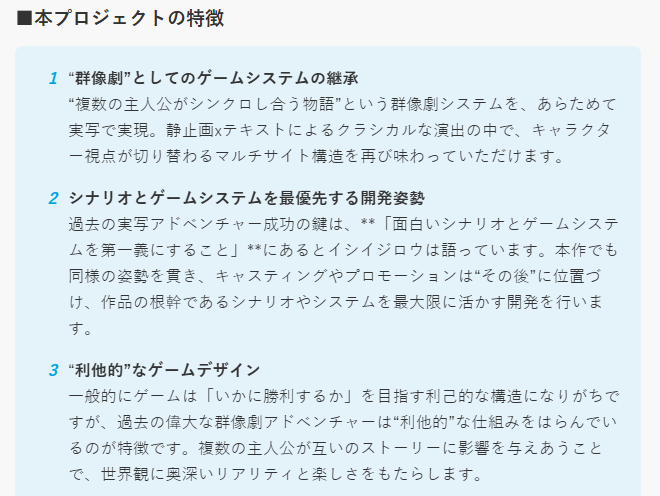·新策划依然选定涩谷位置,暂名《涩谷真人影像冒险项目》,剧本方面邀请了曾经的《428:被封锁的涩谷》老搭档北島行徳,据悉本作整体为“多位主角的同步即时物语展示剧配合静止文本的游戏”。