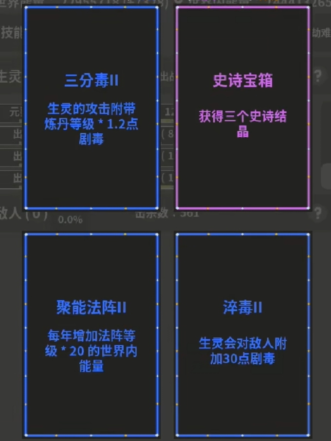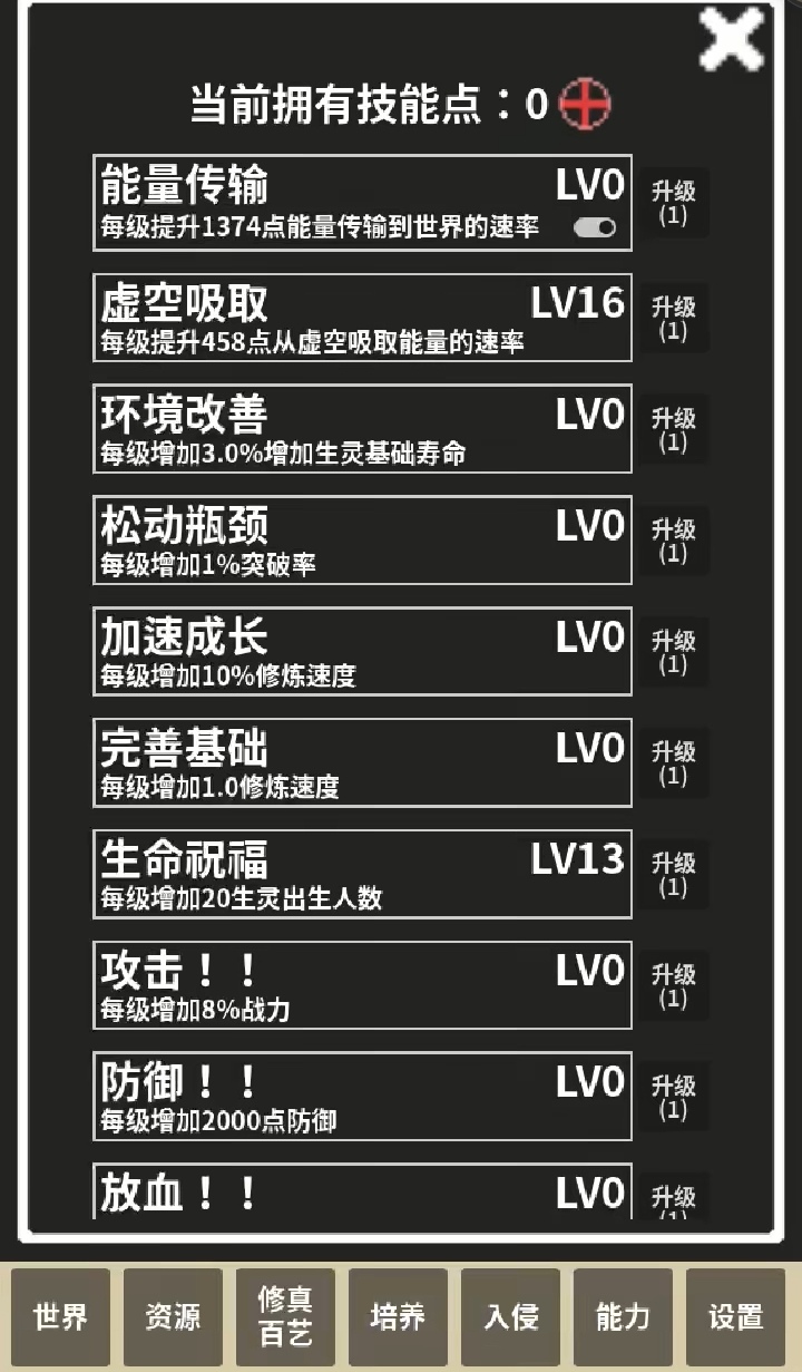 刚开始出现蓝色技能点的可以点,去技能那里给虚空吸取,偶尔点一些灵石矿把修真百艺点开,全部一键确定后就不用管了,后面出现向淬毒,三分毒,尸爆,毒圈之类的毒词条都可以点,有虚空基数优先点,保持世界能量持续增加