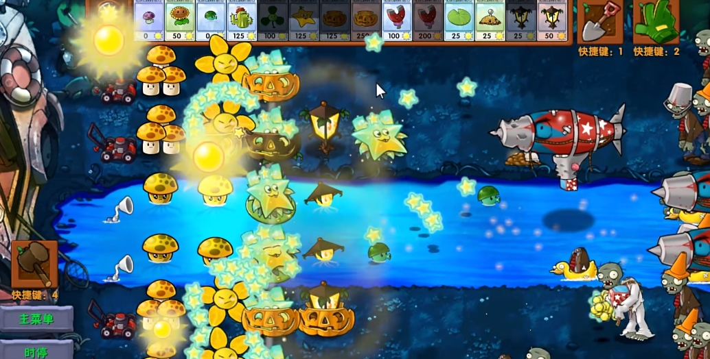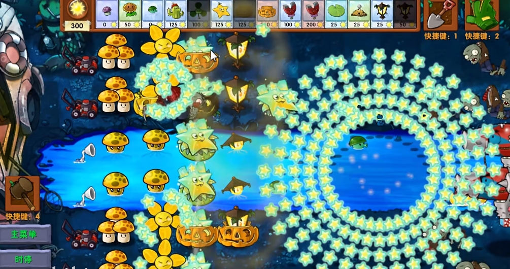 牵引巨大流星砸下地面,对毁灭菇范围内的僵尸造成1800伤害随后生成5*36颗星星子弹。
