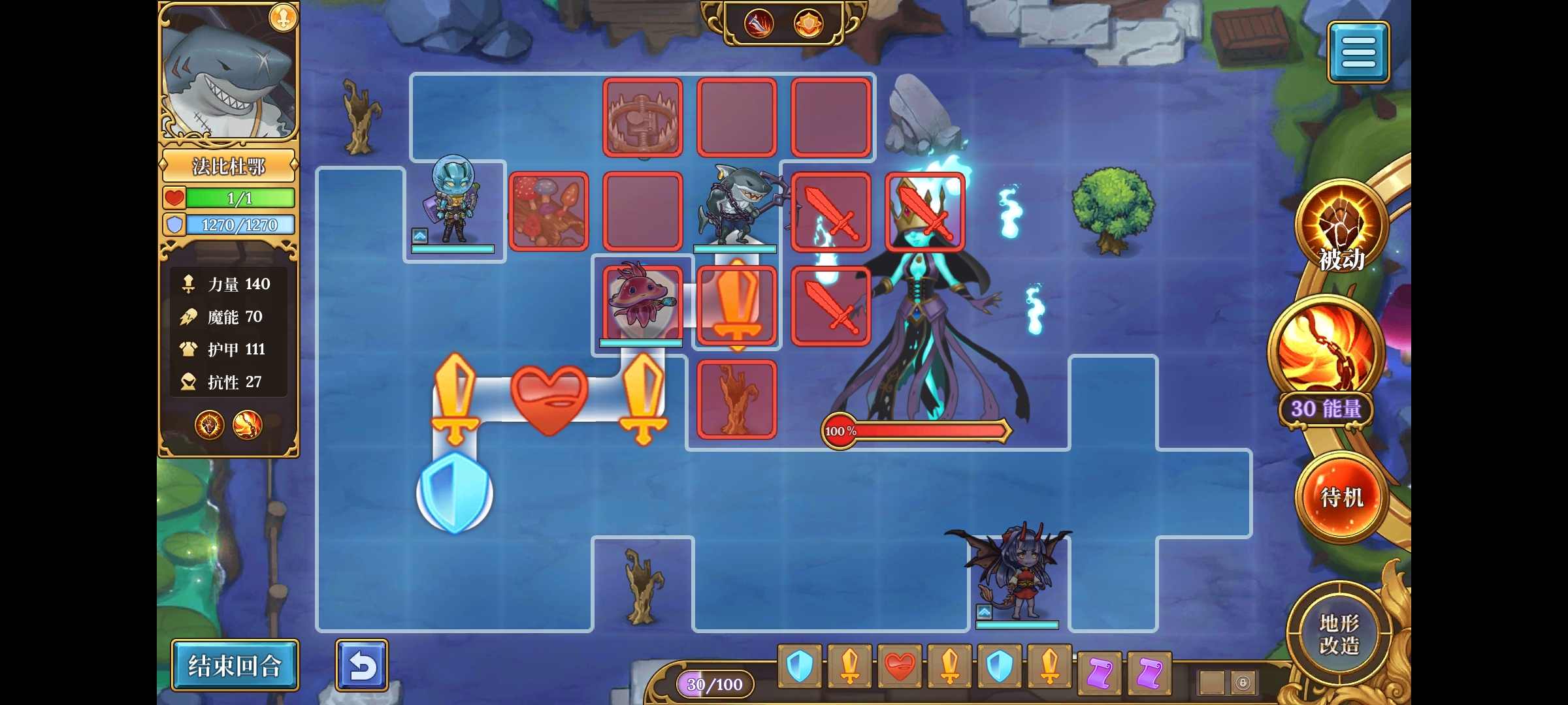 主动技能-横扫,攻击范围是2格,所以可以在第一回合汀汀姬把站得比较散的怪点掉后,鲨鱼上去横扫把站得比较密的怪清怪,从而实现快速清图;或者遇到幽灵女皇这种需要击破头上皇冠/清光侍女才能对其造成伤害的boss时,