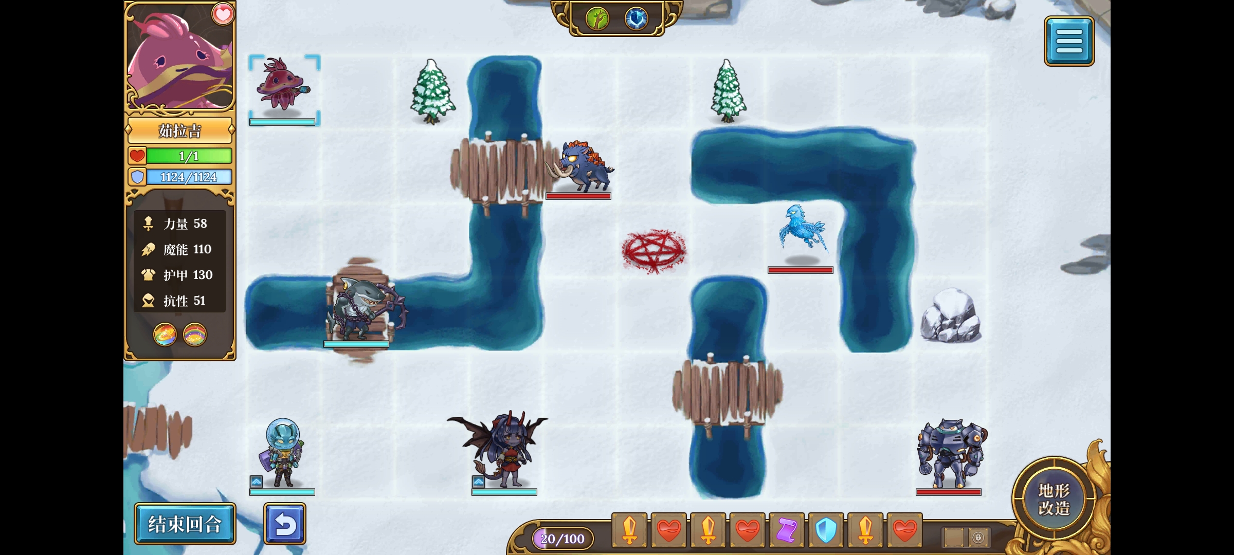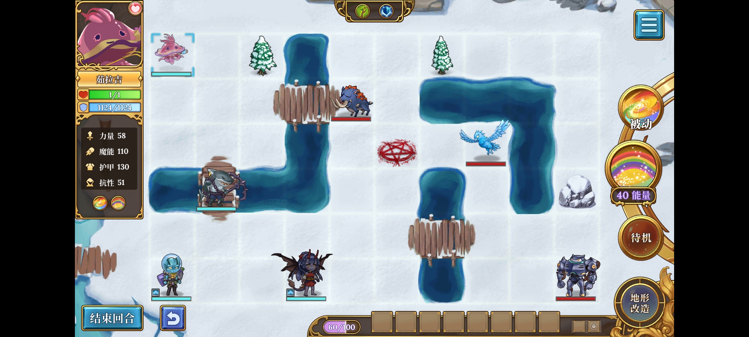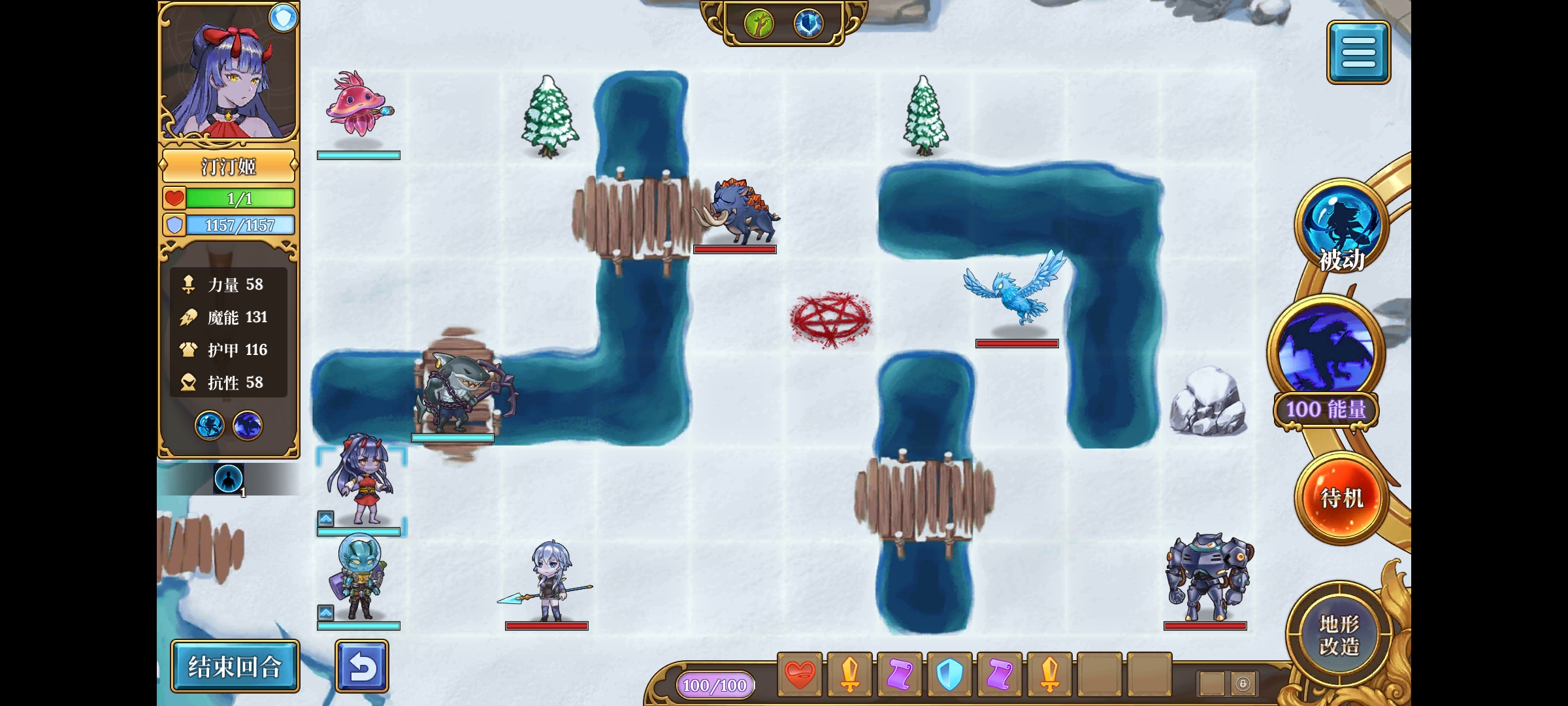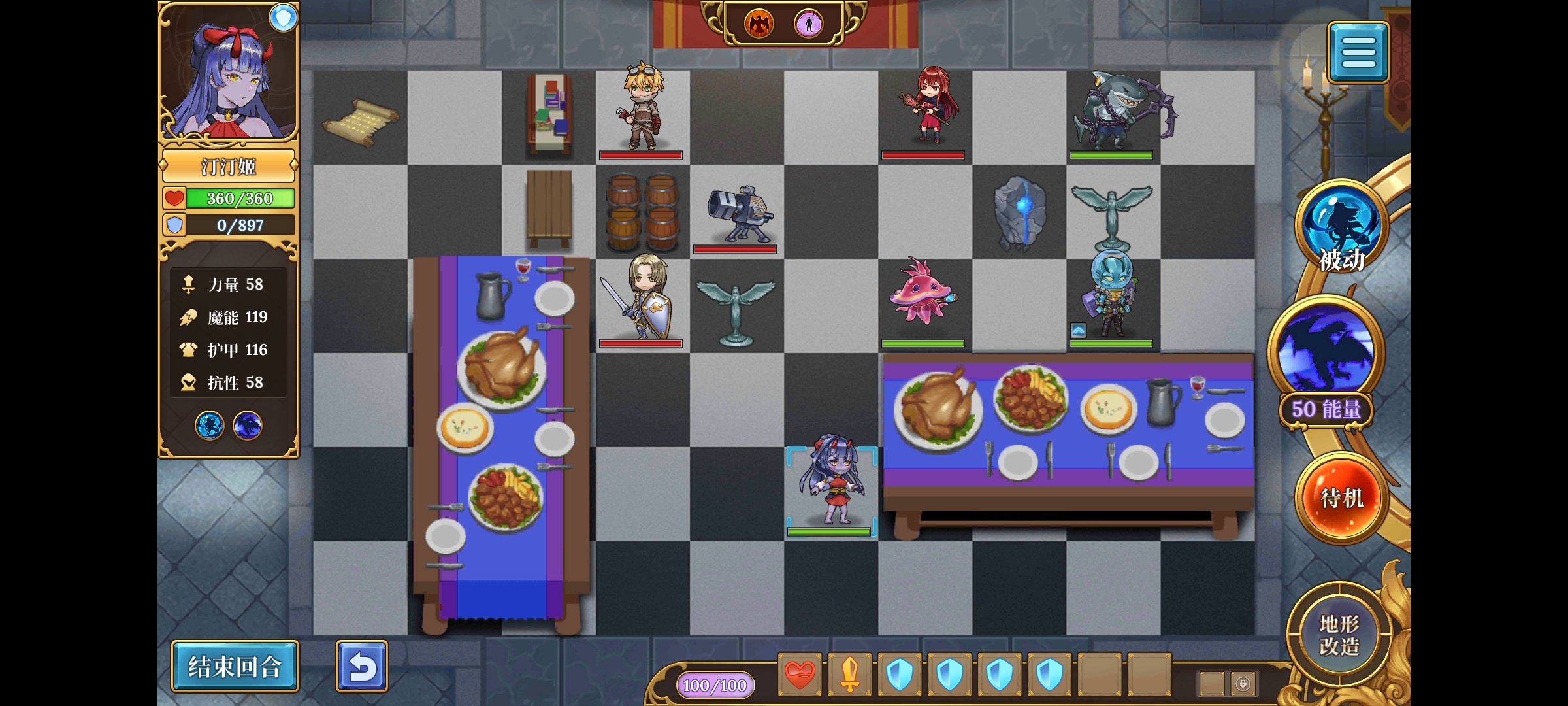 开局汀汀姬变身,消耗4指令无敌的同时攻击,如果有额外回蓝/回血指令时,一同消耗掉。(或者可以选择不点1号符文,只消耗50能量变身,这样可以100%实现汀汀姬第一回合变身攻击-水母回复指令-鲨鱼横扫的连段。)