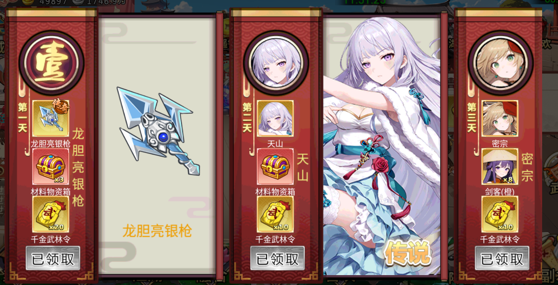 龙胆亮银枪*1、材料物资箱*8、千金武林令*90、SSR宝物任选箱*1、UR宝物任选箱*1、紫色形象礼盒*1、3级宝石随机箱*3、5级宝石随机箱*1、剑客(橙)*8、天山*1、密宗*1、少林*1