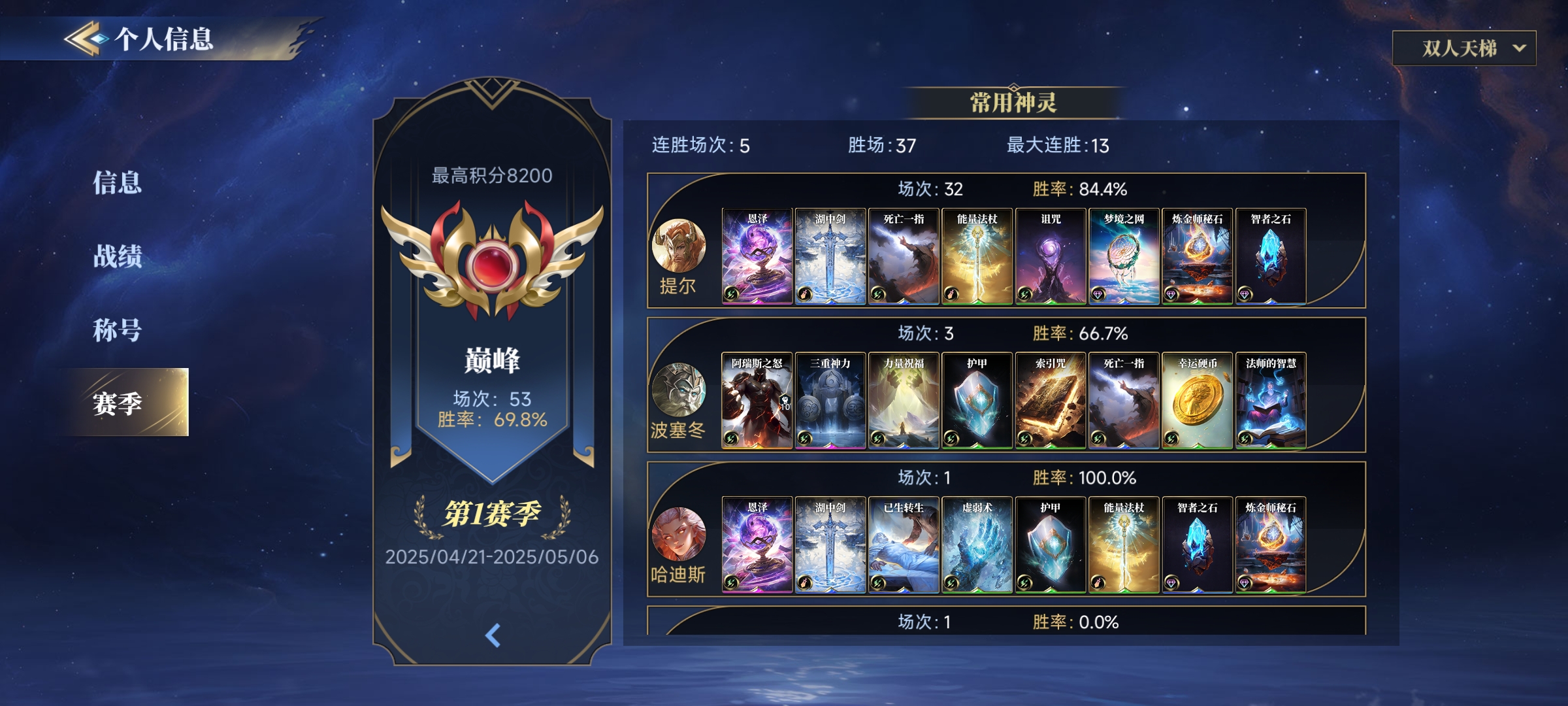 3、有一说一,这个单人排位是真的恶心,打了五天,打到后面,排位禁2个,匹配到的老是禁提尔,然后拿着不擅长的神灵对打真的是要吐了,特别是遇到会配卡的,一直被血虐