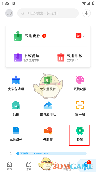 2、进入到新的界面之后,在这里拥有很多功能,我们点击其中的“设置”图标。