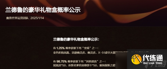 1、魔兽世界官方在2025年1月14日发布公告,公示了兰德鲁的礼物盒的掉率。