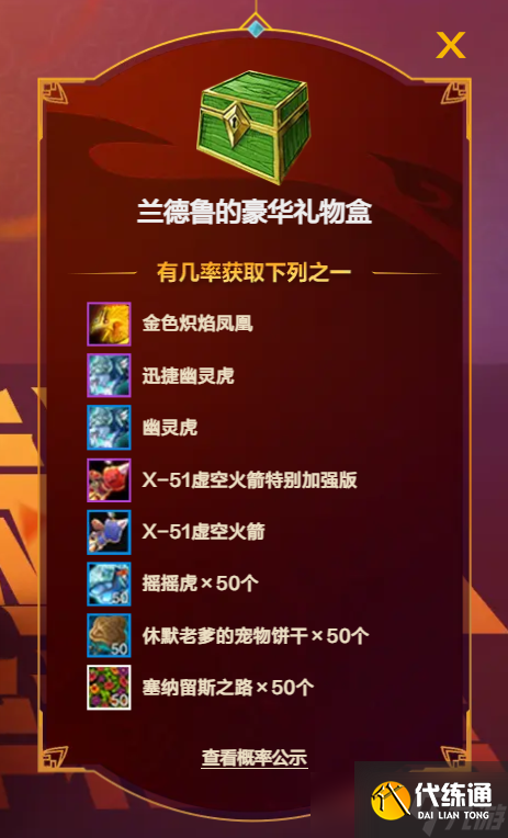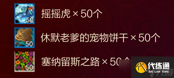 3、坐骑包括:“金色炽焰凤凰、迅捷幽灵虎、幽灵虎、X-51虚空火箭特别加强版、X-51虚空火箭”,其他道具包括:“摇摇虎*50、休默老爹的宠物饼干*50、塞纳留斯之路*50”。