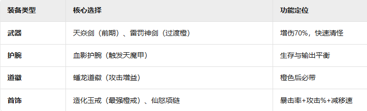 武器:天焱剑(前期增伤70%)、雷罚神剑(过渡橙装)为首选,分解多余武器获取紫石头。