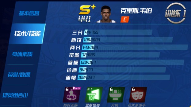 【三技能】花式多面手:多样的进攻手段,每进一球,自身三分增加X%,自身两分增加Y%,最多触发3次(消耗:中锋手册、盖帽训练卡、哑铃、克里斯.韦伯训练计划、陪练教练为自己-大师级别)