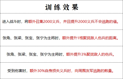 ● 自身义兵小于一定数量时将不会逃跑(可与 技能聚义、指挥技兵法坚忍不拔效果叠加);