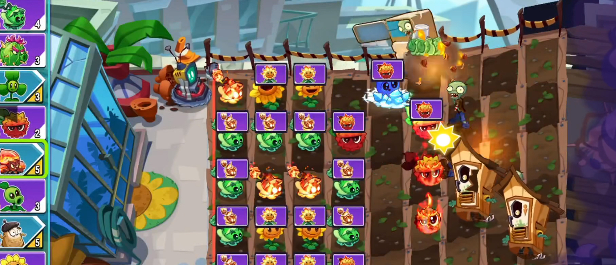 第一关我们会解锁冰箱僵尸及火系植物岩浆玉露,这一关挺简单的。冰箱僵尸惧怕火焰,岩浆玉露可以和其他植物合种,帮助其他植物进化成火系植物,我们可以利用岩浆玉露将向日葵进化成为熔岩向日葵,而熔岩向日葵可以帮助火系植物进化,实力也会提升很多。不过冰箱僵尸挺耐打的,最直接的方法就是用岩浆玉露炸,轻松拿捏第一关。第二关会解锁怪盗小鬼僵尸,它会偷走非火系植物,这关没什么需要注意的,怪盗小鬼僵尸没有那么厉害,拦住它就成。
