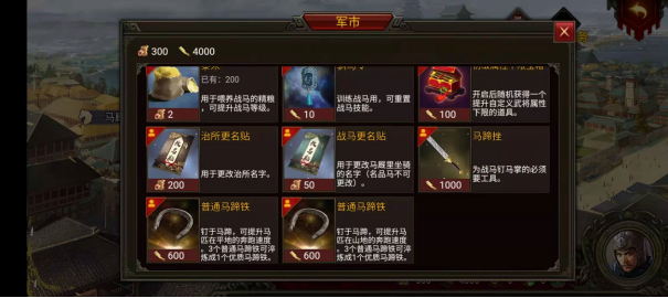 基本介绍:在军市购买马蹄挫和普通马蹄铁后可为战马安装马蹄铁,提升战马奔跑速度。