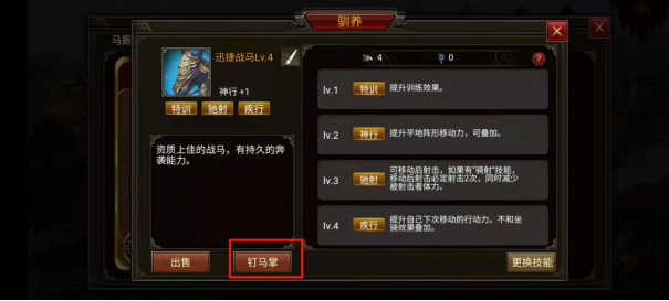 1、战马驯养到最高等级之后可为战马钉马掌,钉马掌时会消耗一个马蹄挫