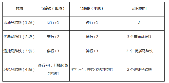 3、马蹄铁可与战马本身的提速技能同时作用,最高可得到+5的作用。马蹄铁装备过后无法拆卸,替换马蹄铁后旧马蹄铁将会保留,不会被覆盖。