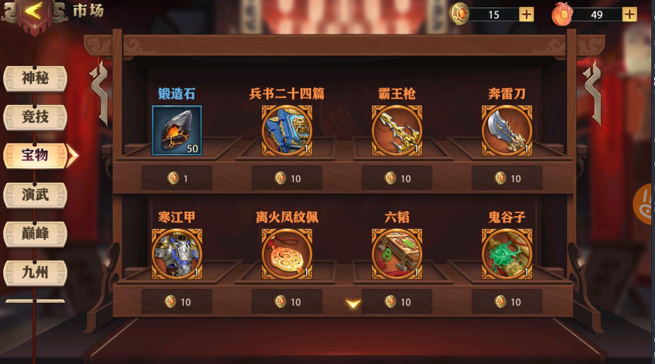 在宝物市场中锻造石可以忽略,珍宝币和至宝币的价值都非常高,记住以下几点:(1)优先兑换可以激活宝物羁绊缺的那些宝物。(2)都激活之后平均进阶。