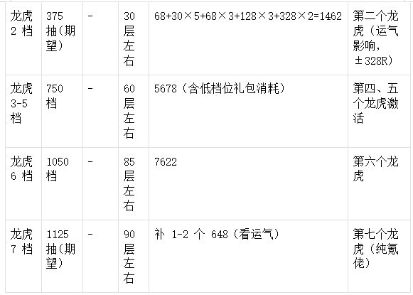 中氪:龙虎 1-2 档(550-1462R,18-30 层),激活龙虎核心古董,配合传说层 375 抽冲属性。