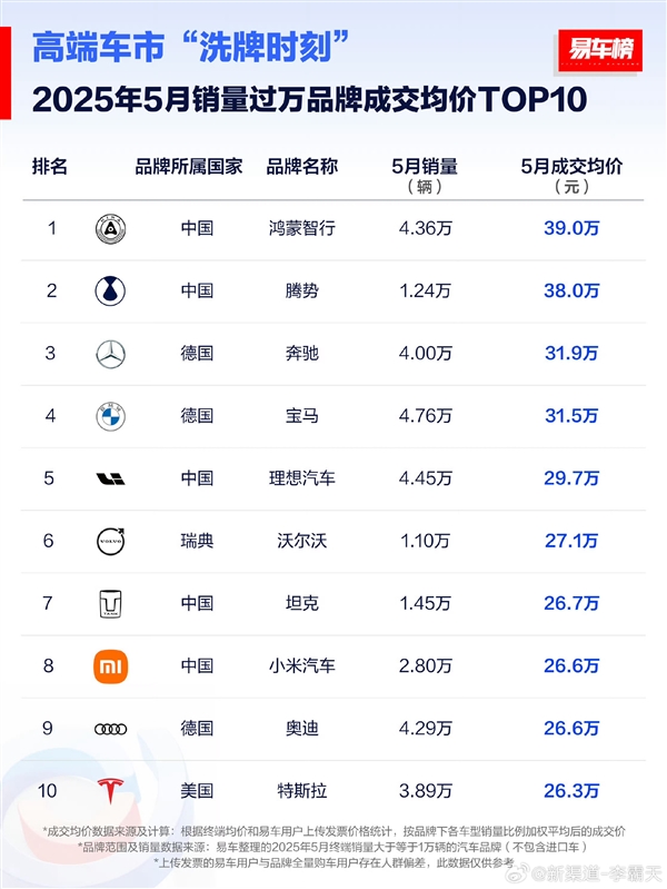 近日,数据博主“新渠道-李霸天”与易车公布了2025年5月国内汽车品牌终端成交均价的前十名。