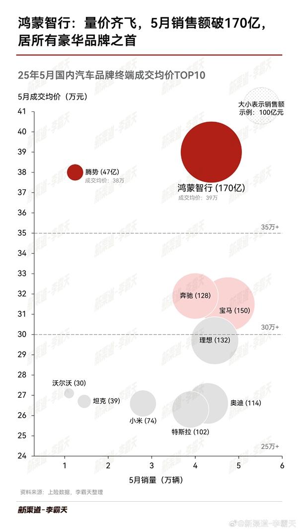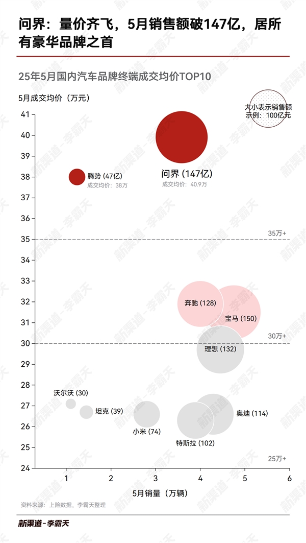 鸿蒙智行单月销售额170亿,5月销量4.36万,均价39万高居榜首,如果单独拎出问界,它的品牌均价更是高达40.9万。