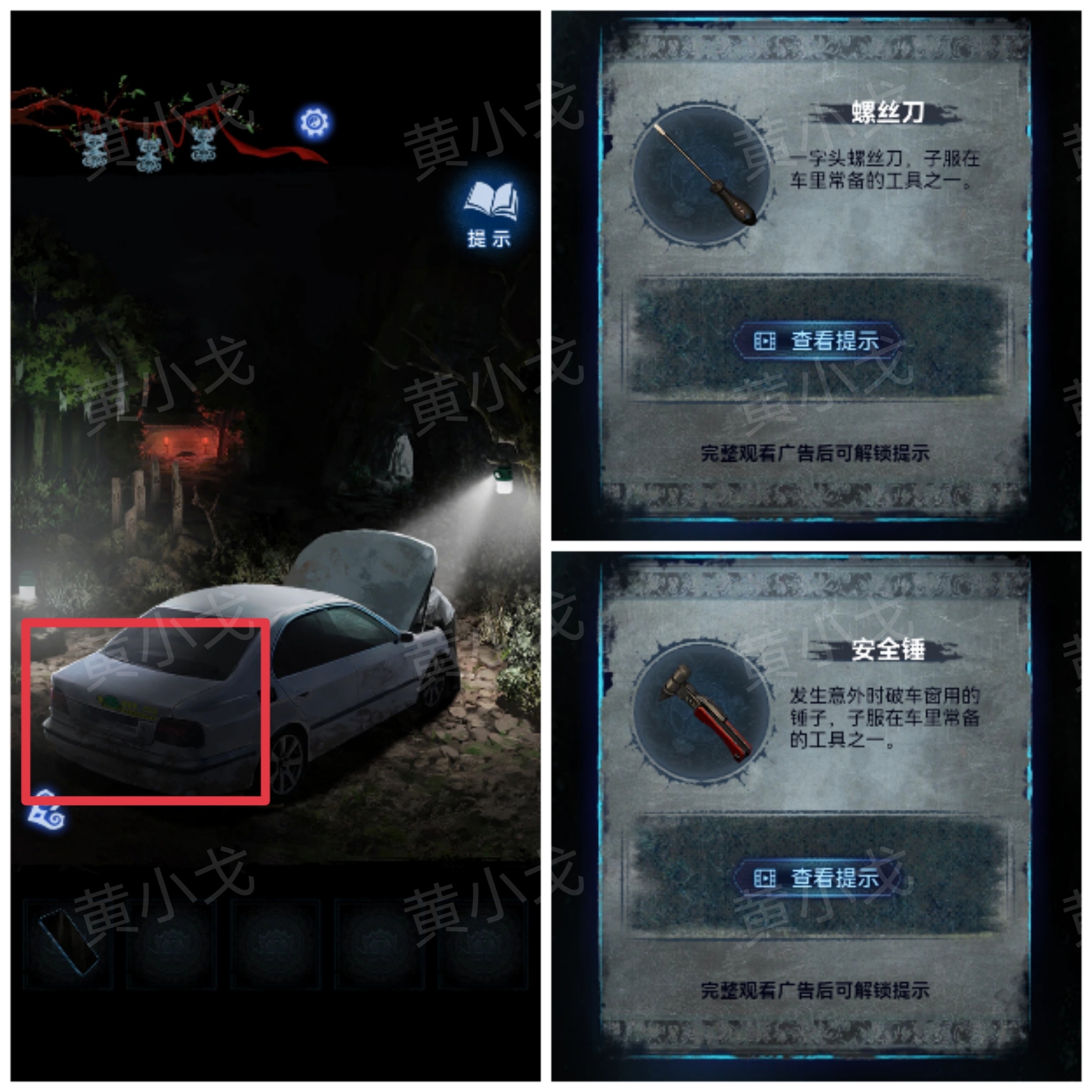 1.打开汽车后备箱,获得【螺丝刀】和【安全锤】