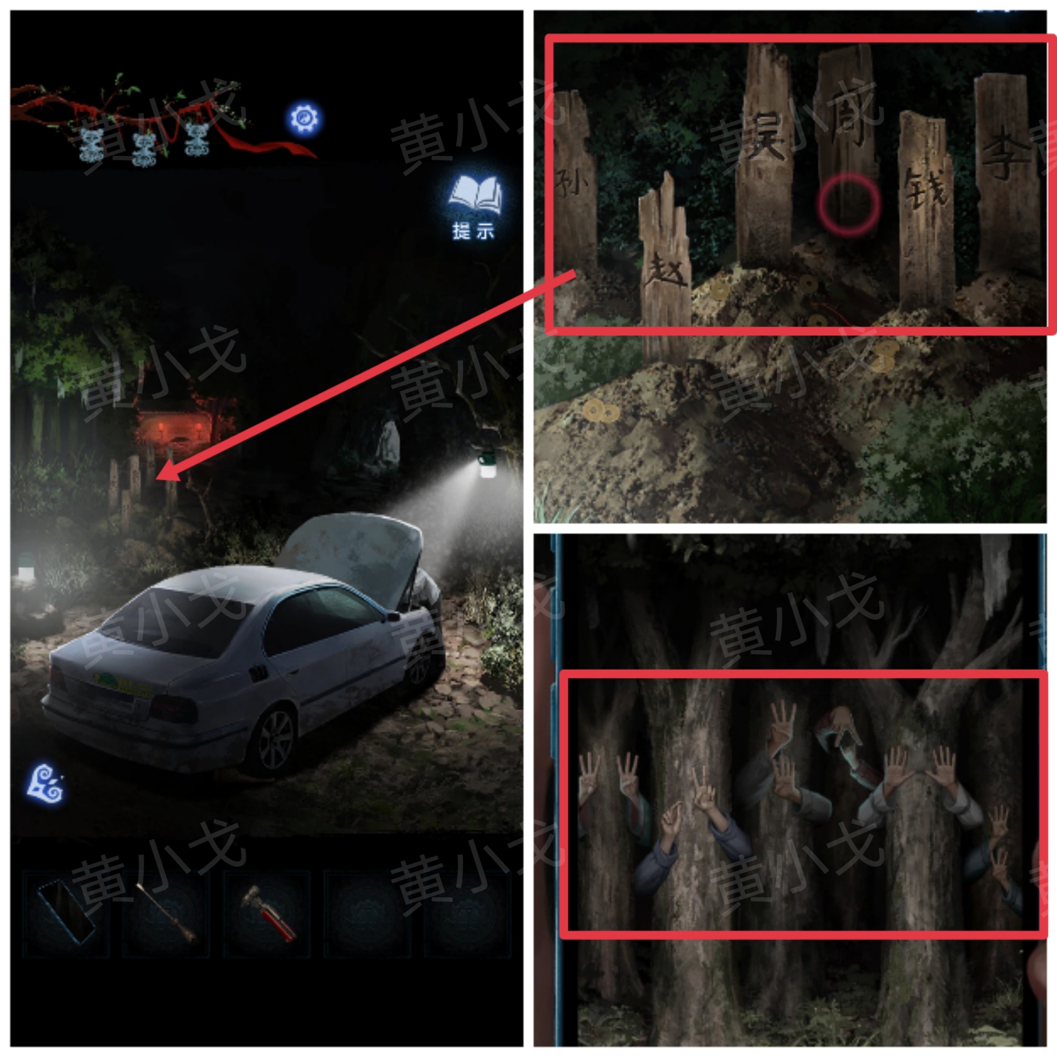15.点击墙上的机关,根据《鬼術篇悟》上的线索和[车]场景通过手机观察树林得到的线索,调整机关
