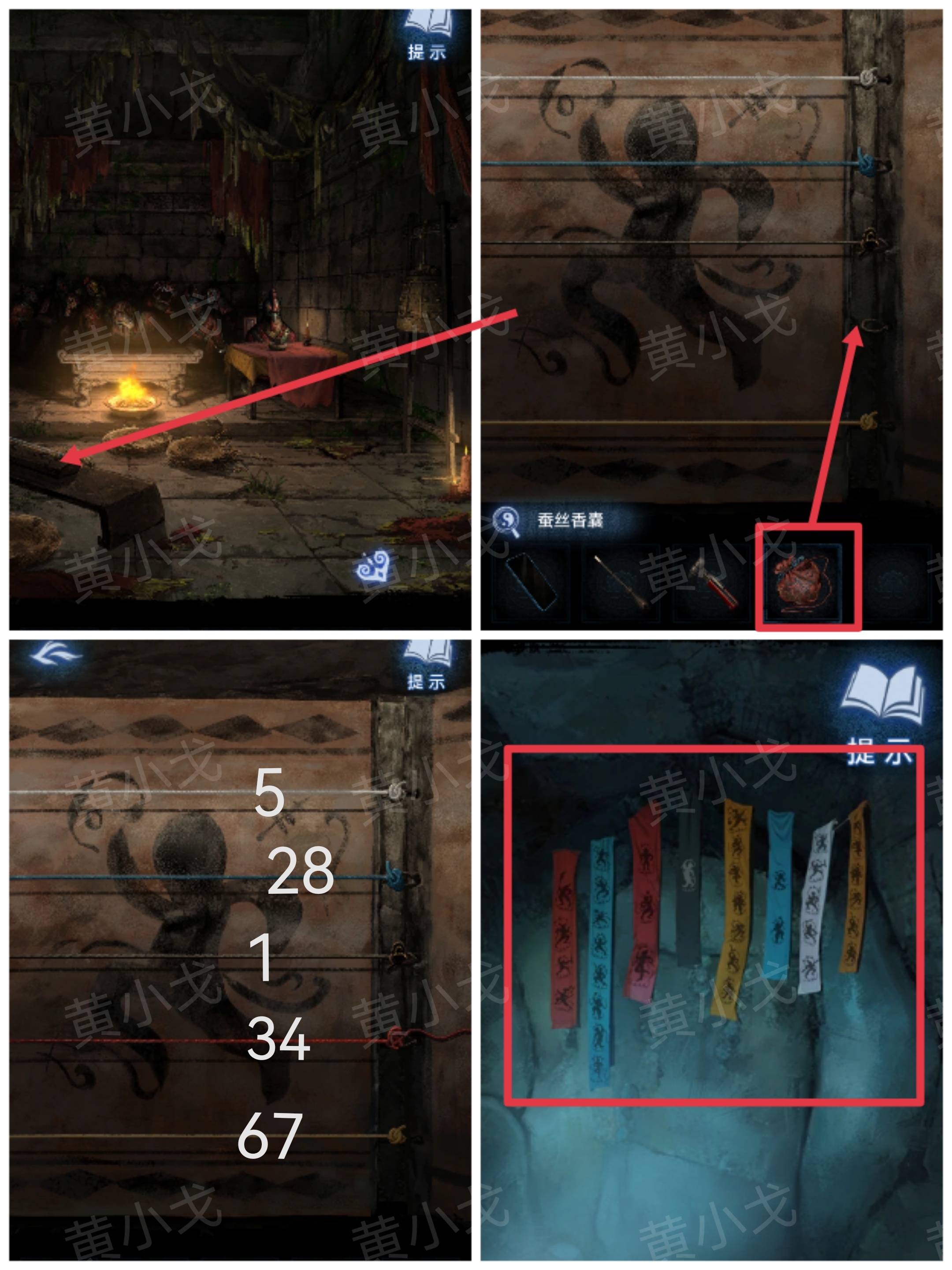 7.点击琴,接上【蚕丝香囊】;根据山洞里的布条线索,按顺序按下对应颜色的琴弦