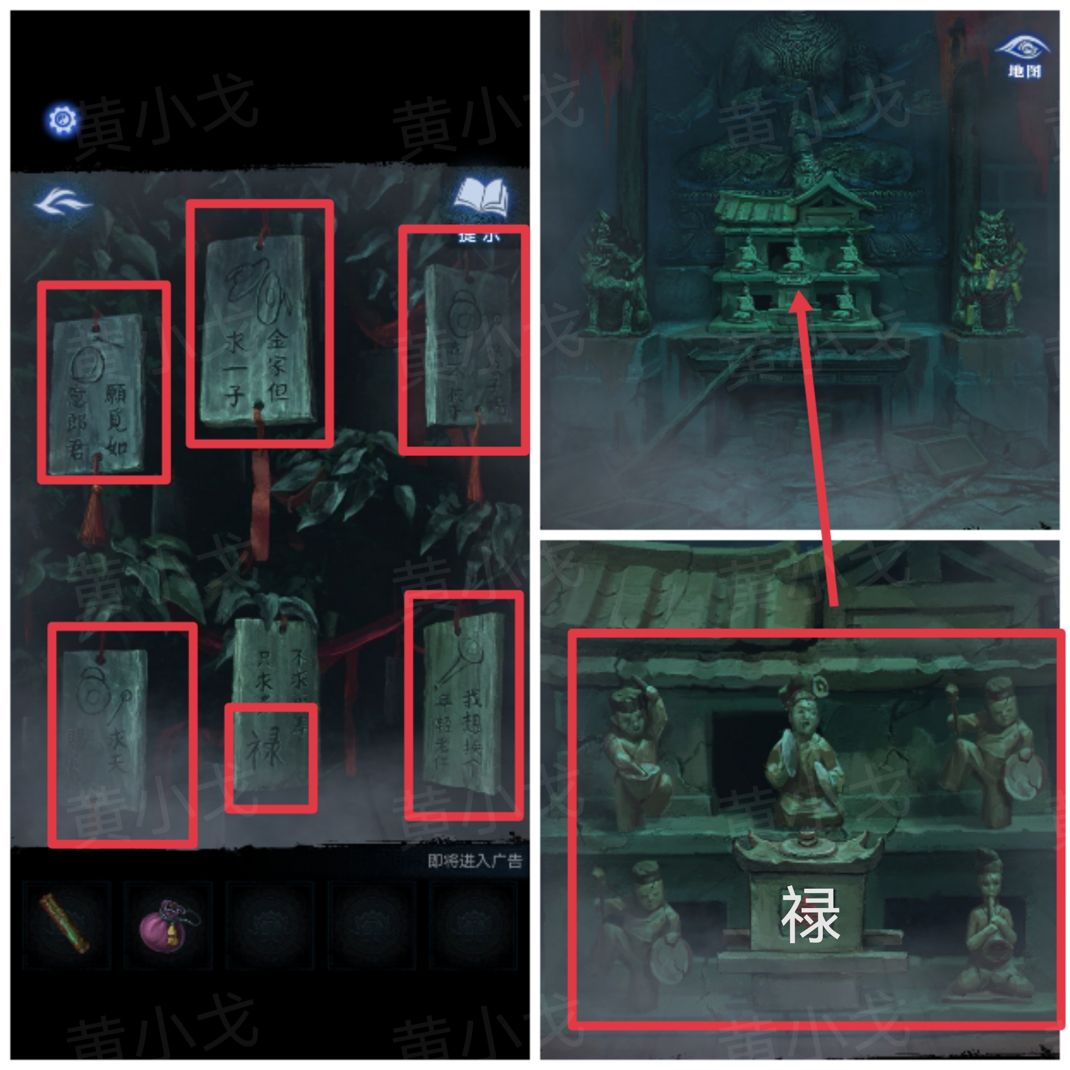 9.点击屋子模型,根据[纸人庙]场景许愿牌线索, 调整对应位置上的陶人和石块上的字为禄