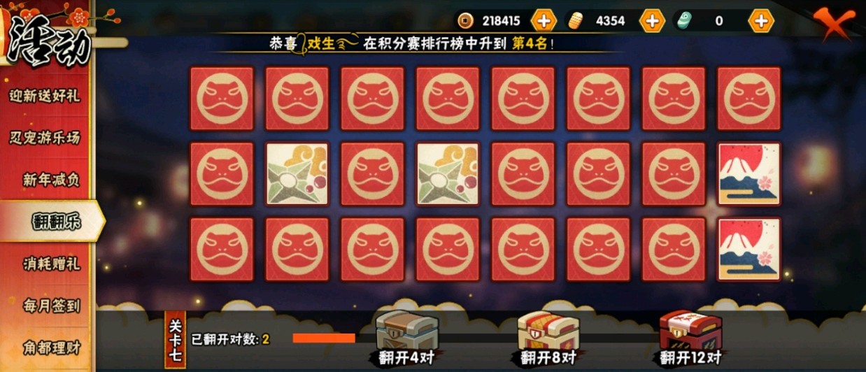 游戏里面有一个费时间的活动,叫做翻翻乐,这个活动完成起来还是可以的。它主要要记住卡牌位置,翻开两张一样的卡片才能配对成功,到达一定量方可进入下一关。它的奖励,还是不错的。