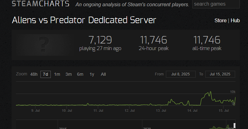 还记得2010年推出的经典游戏《异形大战铁血战士》么?日前这款游戏突然爆火,玩家在线最大峰值从之前的547人暴涨到11740人左右,据分析或许是官方举行的朋友支援活动助力。