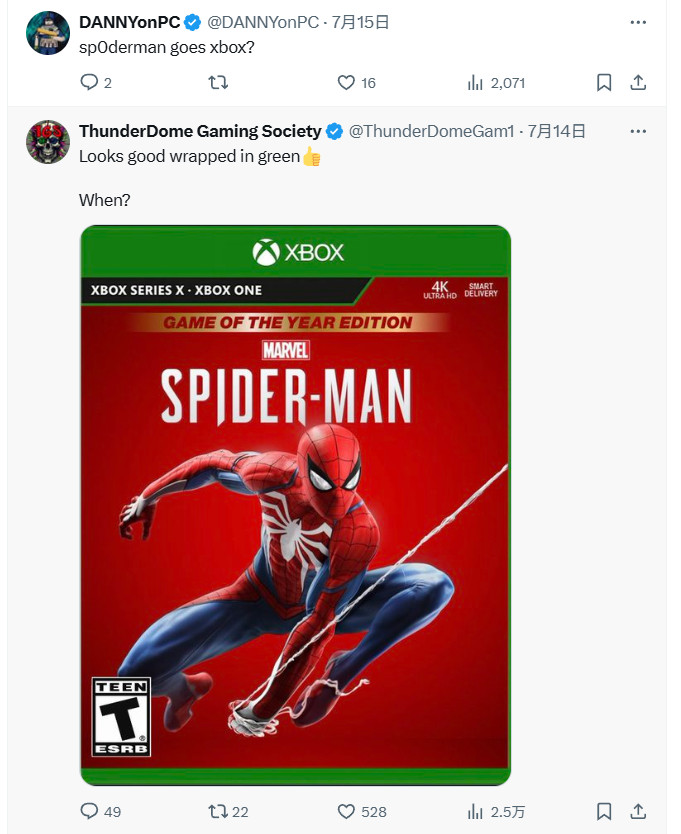 甚至有玩家PS了一张《漫威蜘蛛侠:年度版》登陆Xbox的游戏封面: