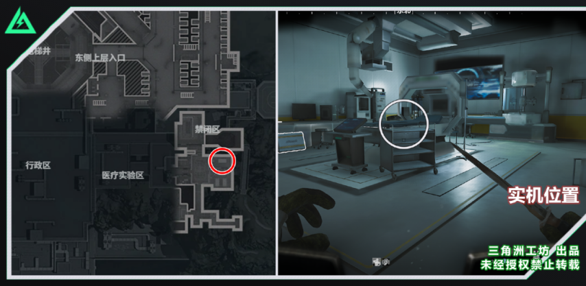 (5)位于医疗区东边的生物实验区,需要使用二级权限卡才能进入(顺便说一下,高级权限卡能开低级的权限门),在这个手术台上右概率刷海洋之泪。通过医疗区东边的滑索就能下到刷卡的门前。