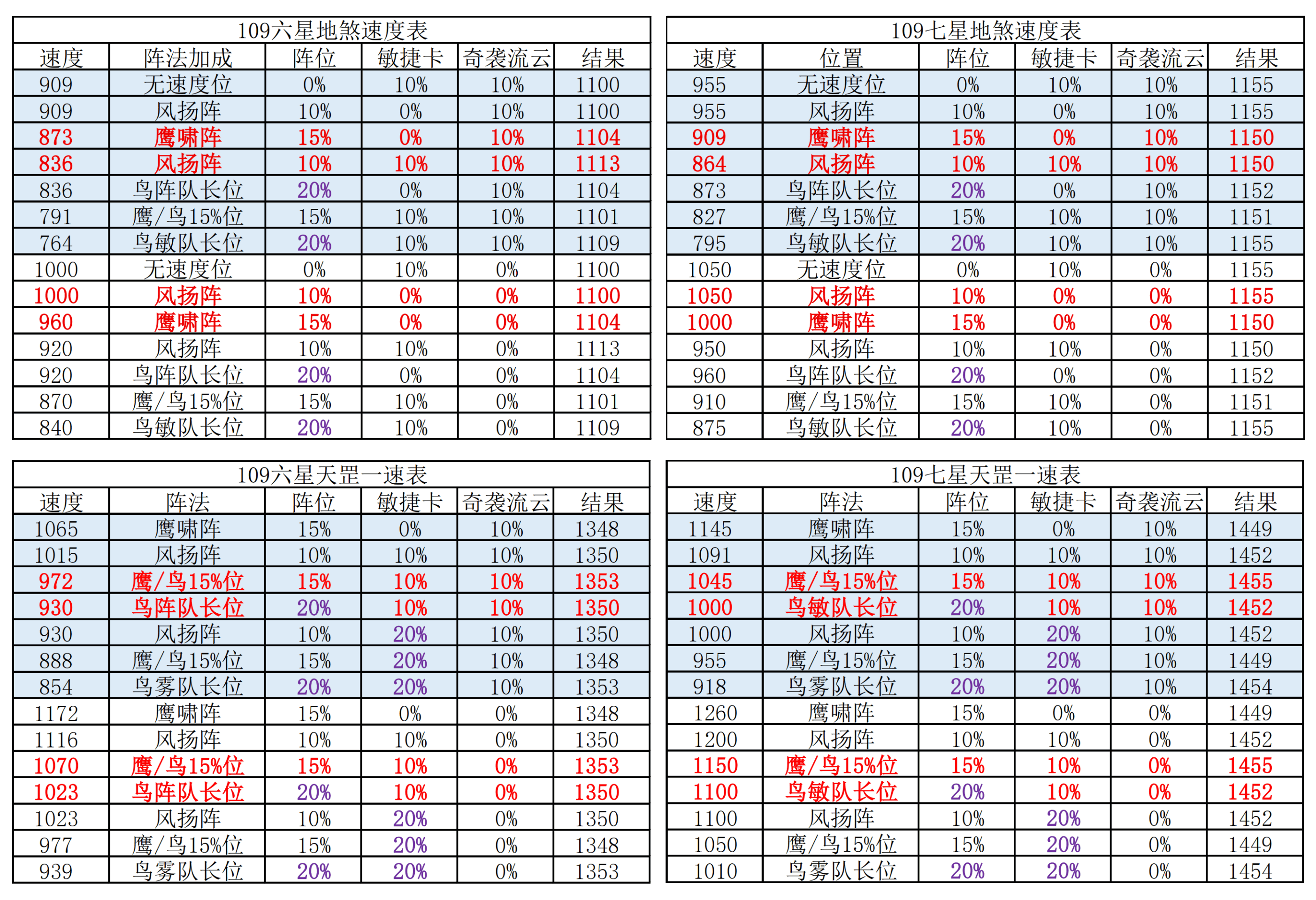 根据速度表(重点关注红字部分),如果要杀7星天罡的话建议将速度堆到1140左右(擂台符)变僵尸卡站15%速度位可以应付大部分的天罡星,如果只是为了杀六星地煞的话速度建议调到1000(避免带队没有速度位可以变敏捷卡或者奇袭流云快过99%的怪)。