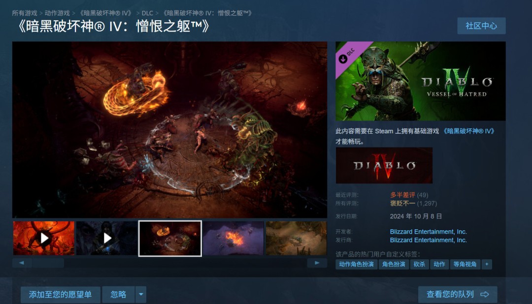 今年4月,暴雪公布了《暗黑破坏神4》2025年的路线图,但并未获得玩家好评,首个资料片“憎恨之躯”口碑崩坏,Steam评价“多半差评”。