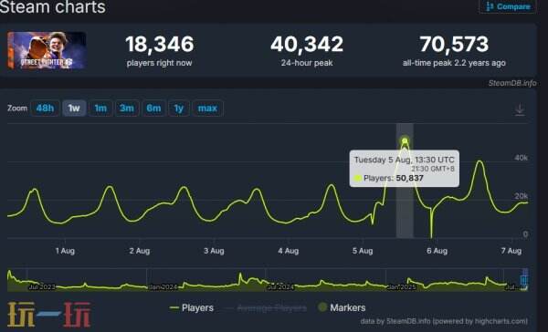 根据Steamdb的数据,《街头霸王6》在推出更新的当天,Steam平台上的在线玩家峰值从27913人激增至50975人,几乎翻了一倍。当前,本作24小时内的在线玩家峰值也有40342人,相当惊人。