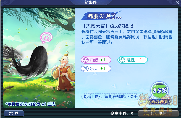 (2)观看奇遇故事并且帮鲲做出抉择,根据选择的不同获得对应的属性提升。这类事件提升的属性较多,需要玩家根据选项中的文案自行判断增加的属性,随着性格养成进度提高奇遇故事才会出现。