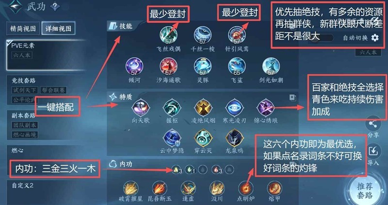 这六个内功即为最优选:破霄/昆吾/汲川/熔甲/逢虚/点名录,来开三金三火一木周天即可!如果点名录词条不好可以拿好词条的灼锋来替代!