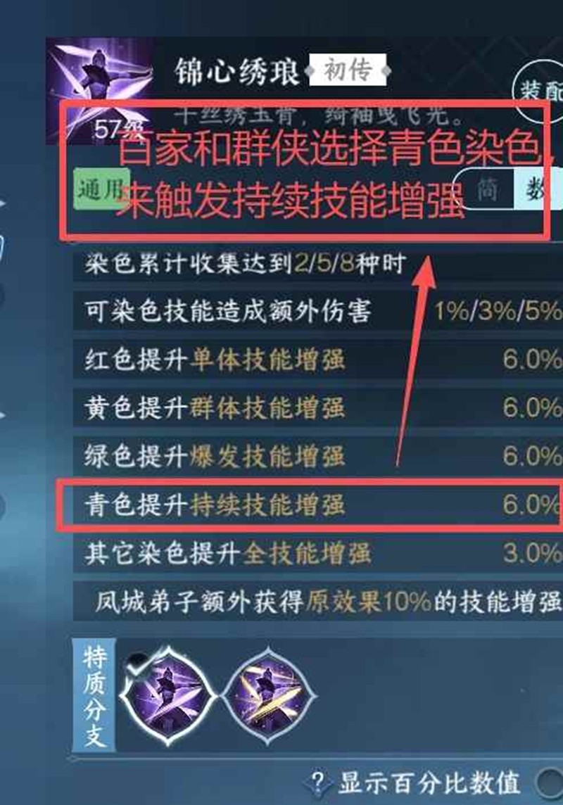 特质直接照抄即可,唯一注意带锦心绣琅的话,百家和绝技记得选择青色染色,来触发锦心绣琅的持续技能增强效果!!