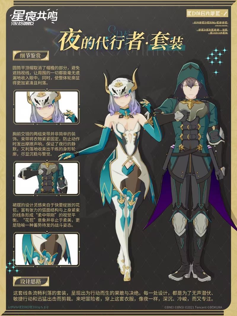 本次更新中,最引人注目的是全新套装“夜的代行者”。这套流畅利落的套装,旨在为行动而生,展现出果敢与决绝。套装设计注重细节,如圆筒平顶帽取消帽檐以避免遮挡视线,束带设计确保夜行时的静默,裙摆设计灵感来源于花苞,隐喻战斗姿态。