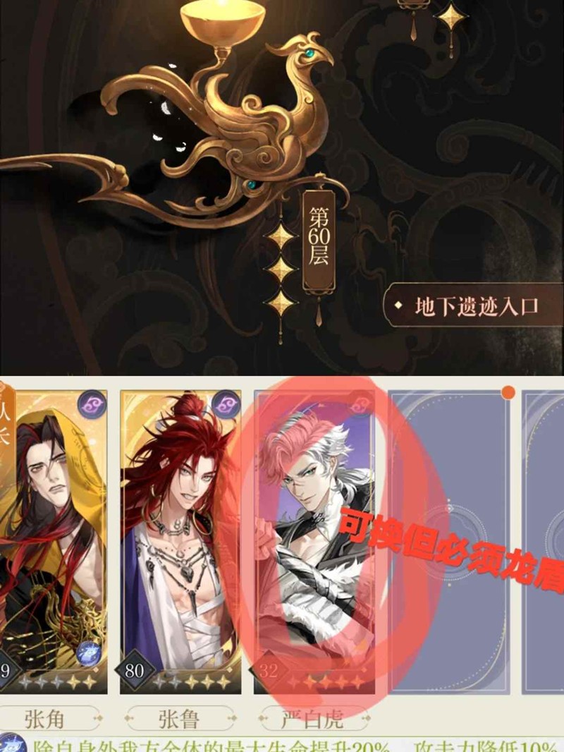 60:机制还是一样,攻击高的挨计数本,打到第三次会出现小兵,小兵必须先挨龙盾打才能收到伤害,所以角叔+张鲁+龙盾(我就是图严白虎开大是群攻而已)