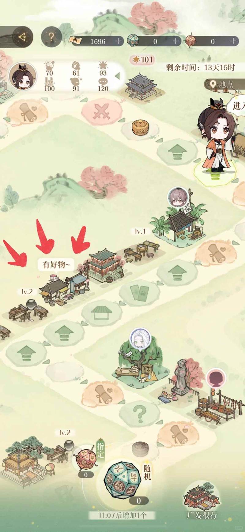2、属性不够可以在集市(箭头所指)买 或者去图示的那种船(都需要票子!船票要800 记得留好)然后选择能加对应属性的地点 能去到地图 加大量属性 并且是永久的 比集市买一次性的划算