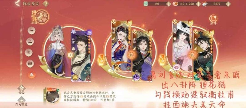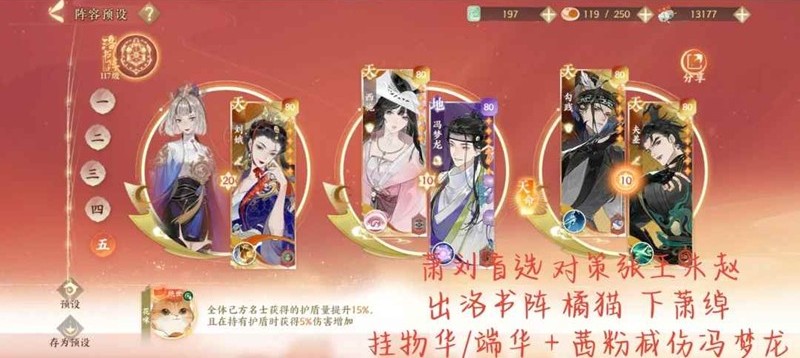 打张王朱赵/曹植,出橘猫换洛书阵,刘娥单挂,萧绰换冯梦龙,对面大概率打不动我们,打得动可以跑了,毕竟是克制我们的阵容。