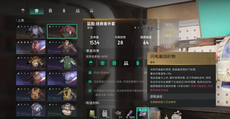 如果将闪电基因织物用于制作上衣装备,还能获得一个特殊的同调效果。当玩家受到攻击时,会在攻击者脚下生成一个延迟3秒的落雷,造成基于4000%超感强度的无差别伤害。这个效果对远程攻击的敌人特别有效,比如使用狙击枪的玩家,落雷会打乱他们的站位并迫使其调整战术。