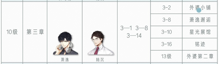 1、第三章章节开启等级为10级,攻略如上图所示,光结局人物:萧逸,夜结局人物:陆沉。