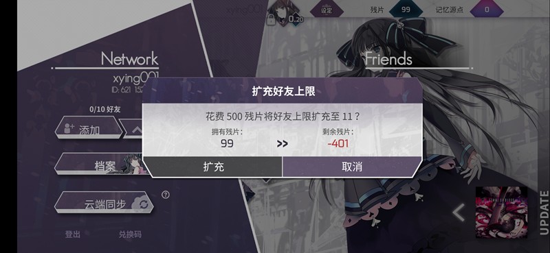 arcaea初始好友数量上限为10人,如果玩家想要添加更多好友,可以通过消耗残片来扩充好友位。在好友列表界面右侧有一个向上的箭头图标,点击后即可使用500个残片扩充一个好友位。这个消耗对于新手玩家来说还是比较高的,需要慎重考虑。