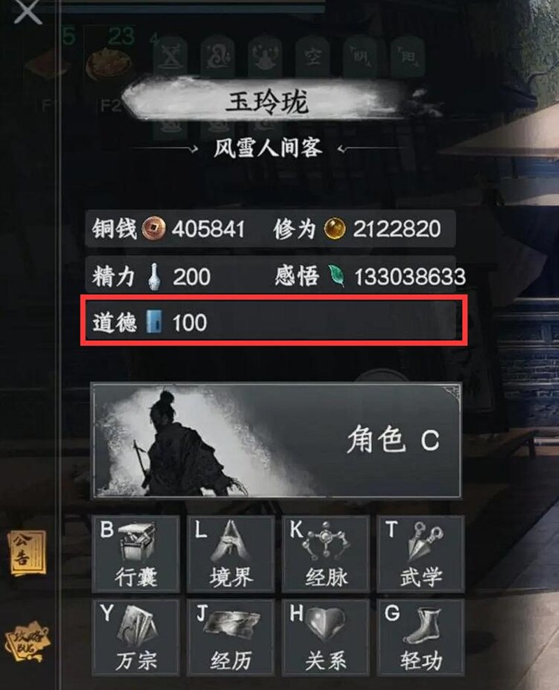 打开游戏主菜单后选择角色选项,在人物界面中角色名称正下方会显示当前道德值数值。道德值的范围在-100到200之间,不同区间会用颜色标注:绿色代表100以上,白色代表0-100,红色代表0以下。界面中还会显示当前道德水平对NPC态度的影响,比如高道德值会让正派NPC更容易提升好感度。