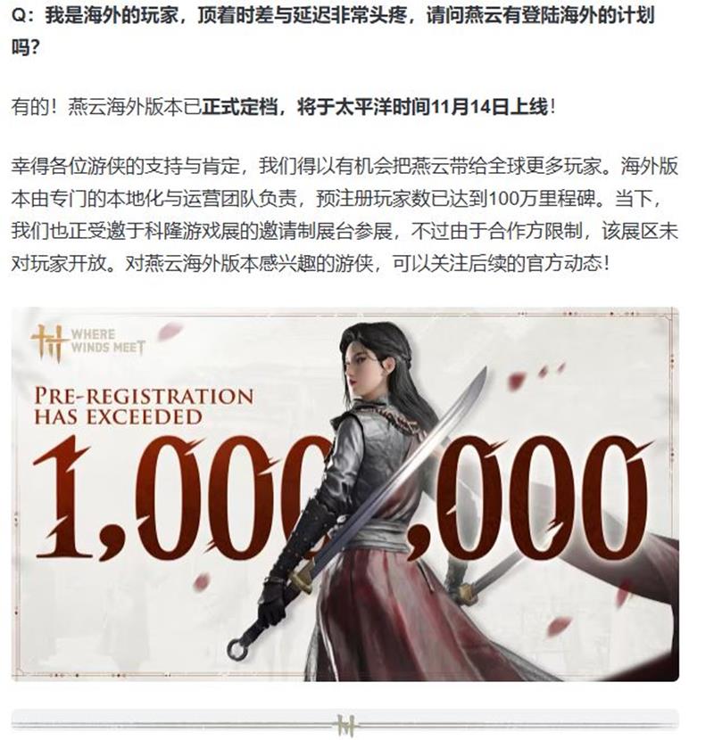 幸得各位游侠的支持与肯定,我们得以有机会把燕云带给全球更多玩家。海外版本由专门的本地化与运营团队负责,预注册玩家数已达到100万里程碑。当下,我们也正受邀于科隆游戏展的邀请制展台参展,不过由于合作方限制,该展区未对玩家开放。对燕云海外版本感兴趣的游侠,可以关注后续的官方动态!
